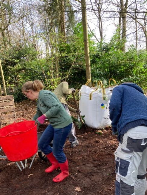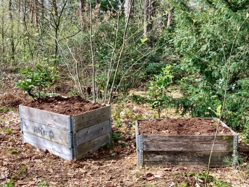 En niet meteen van alles uittrekken dat is nog een mooi leerproces. Zo loop ik iedere dag wel een rondje of twee door mijn bosje om nieuwe planten de ontdekken en de grenzen te verkennen.Er zijn voorlopig vooral veel digitalissen en een flinke lading uitgezaaide lijsterbessen en acertjes. In de twee perken veel dovenetel, en duizendknoop, maar ook tulpen, ornithogalum en iets waarvan ik denk dat het een lelie is, zie foto boven dit stukje, iemand een idee? Joep en Jorieke zijn komen helpen om te kloven, het hout ligt tegen het huis aan hopelijk blijft het deze keer wel “ hangen”. Maar ik ben hier wel op een moestuinforum en niet op een wilde bostuinforum dus er moeten toch wel enkele groente de tuin in, ook al zijn het bv alleen pompoenen en kruiden en een appel en peer enne enzovoorts..het bloed blijft maar kruipen waar het niet gaan kan. De zuil appel begint uit te lopen De trosvlier voor de vogels is geplant, deze foto is van een al volwassen struik Met wat overgebleven schors heb ik een driehoek rond een plek met varens gemaakt zodat die niet plat getrapt worden tijdens de aankomende werkzaamheden aan t schuurtje. Er moeten nog veel meer varens zijn maar we hebben heel wat rond gestampt. Daar vlak achter twee bakken van pallet randen die we van @Jorieke123 hebben gekregen.die hebben we tot de helft ongeveer gevuld met half vergane stukken hout die hier overal te vinden zijn. Ik kan nog wel drie bakken vullen als ik dat zou willen. Maar zo is het mooi. Erop komt aarde/ bosgrond die we weg gaan graven voor het plaatsen van het schuurtje.Eventueel nog wat zakken tuin aarde erop als dat nodig is. Lekker bezig dus. Achter de bakken is een flink stuk vol met zaailingen van lijsterbes( ik wist het niet en heb er ook nog een gekocht 😂) en acer en van die rare laurier en hulst. Voor zover ik het nu kan zien. twee enorme rodondendrons in mijn tuin, de kleur volgt nog ik heb geen idee En toen ik het allemaal had gezien vandaag een eerste rondje door de nabije omgeving gemaakt op de fiets. Daar wordt ik dan ook heel blij van.
