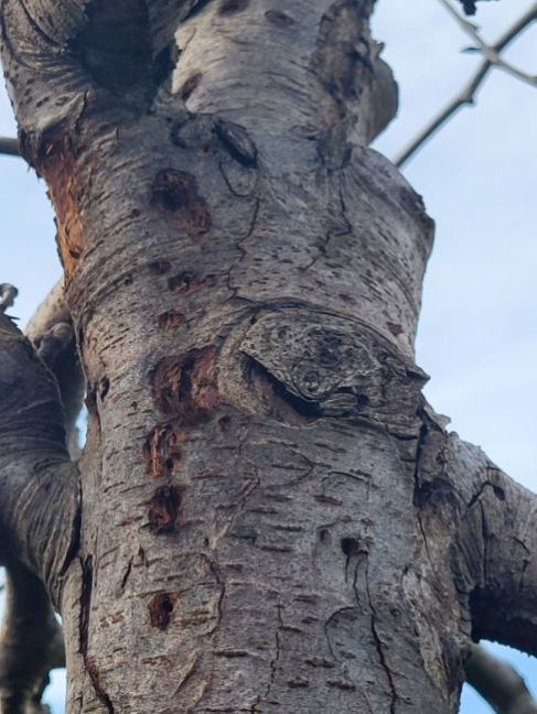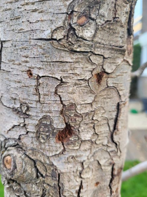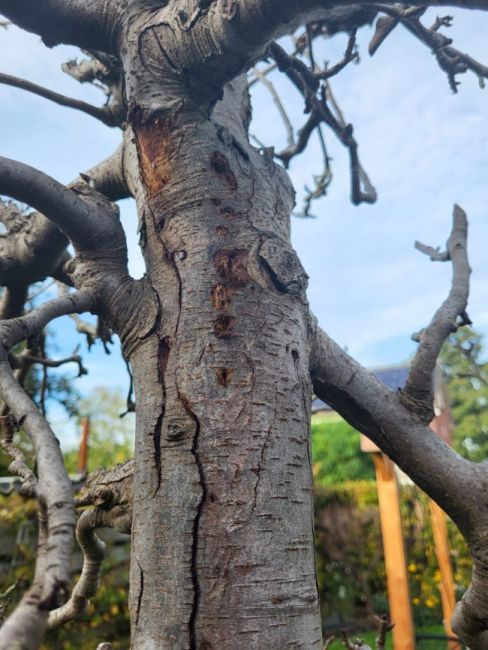 Volgens de hovenier komt dit door een specht...ik heb nooit een specht hier gezien.
