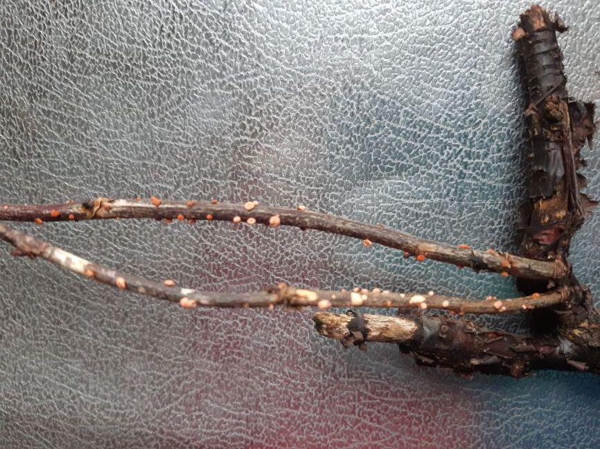 3. Op sommige takken van oude rode bessenstruiken zitten oranjeroze bultjes die ik er zo af kan vegen met mijn vinger. Ik heb geen idee wat dit is. Kent iemand dit?