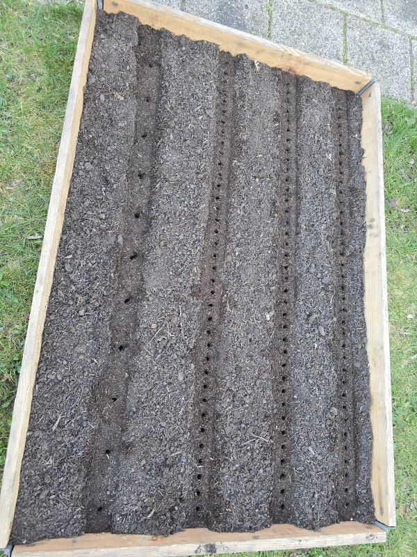 Vandaag eindelijk de eerste palletbak in gebruik kunnen nemen. Wortelen en knoflook gezaaid. En toen was het ineens alweer donker.. Morgen verder met de rest!
