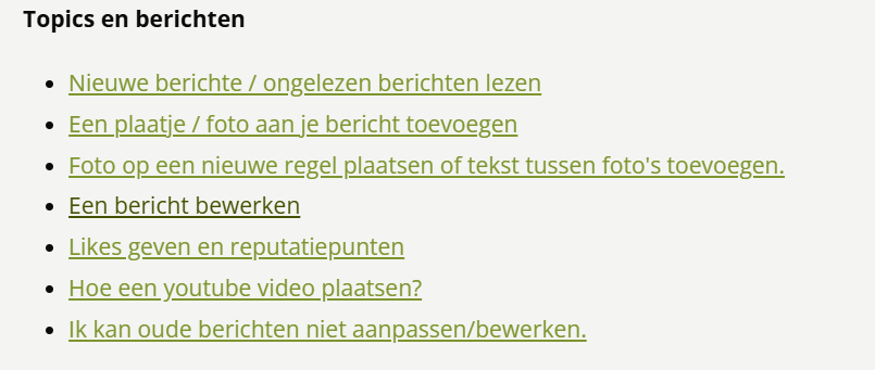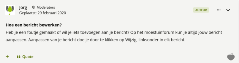 Ah, op die manier. Dat verklaart dan inderdaad waarom ik andere berichten wel kon bewerken. Dank voor de uitleg en het aanpassen! 👌 Ik had gezocht, maar blijkbaar niet goed genoeg. Misschien een klein puntje van feedback om even aan te passen: - Als ik in de forumhandleiding klik op de link 'Een bericht bewerken', dan wordt ik doorgelinkt naar de volgende tekst. Hier staat dus niks in over de '24 uurs-regel'. Uiteraard helemaal begrijpelijk en ik zie de uitleg nu inderdaad ook verderop in de tekst staan. Echter als ik iets zoek, dan ga ik niet alle pagina's met informatie die érna komen ook nog doorlezen 😛