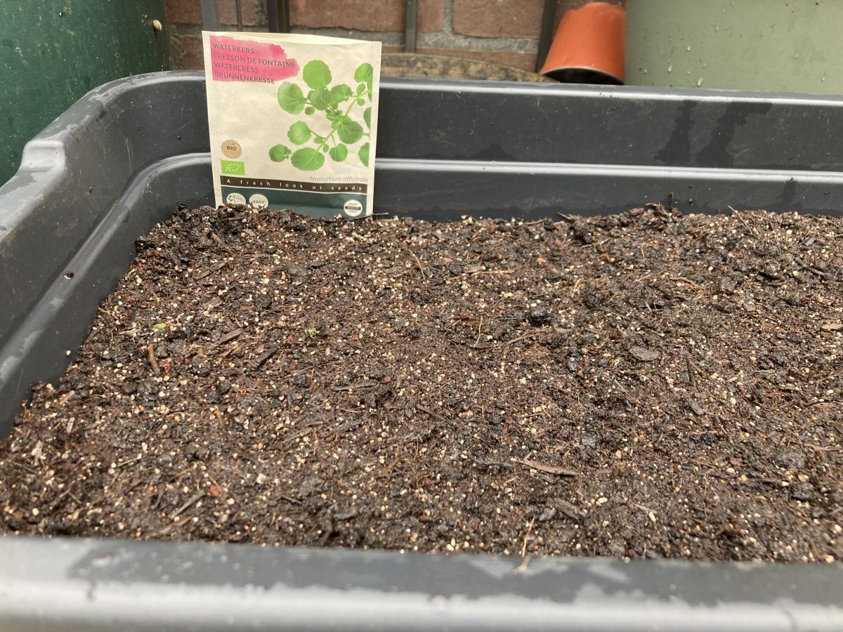 Een paar komkommer Dragons egg zaden hadden worteltjes in de deno, dus die heb ik in potjes met aarde geplant. Verder de cadeau-dahlia’s van Mellie zojuist in water gelegd zodat ze zich een nachtje kunnen volzuigen met water. Morgen oppotten. Tenslotte een hele kweektafel ingezaaid met waterkers. Dit is de ‘natte bak’. Ergens eind juni zal die wel weer leeg zijn en kunnen de waterspinaziezaailingen er tegen die tijd in. Het zijn weer van die 😵💫😬😤minizaden, maar als je goed kijkt zie je overal bruine bolletjes liggen 🔎.