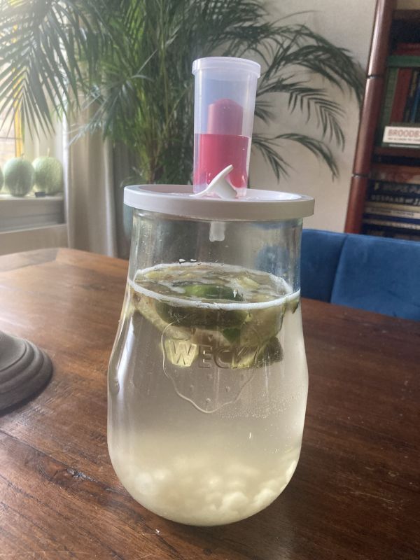 Inmiddels staat mijn allereerste waterkefir-pot lekker te pruttelen. Behalve water en wat suiker heb ik er een kwart limoen en wat halfgedroogde vijgen uit de tuin in gedaan. Morgenavond is het zover, denk ik.