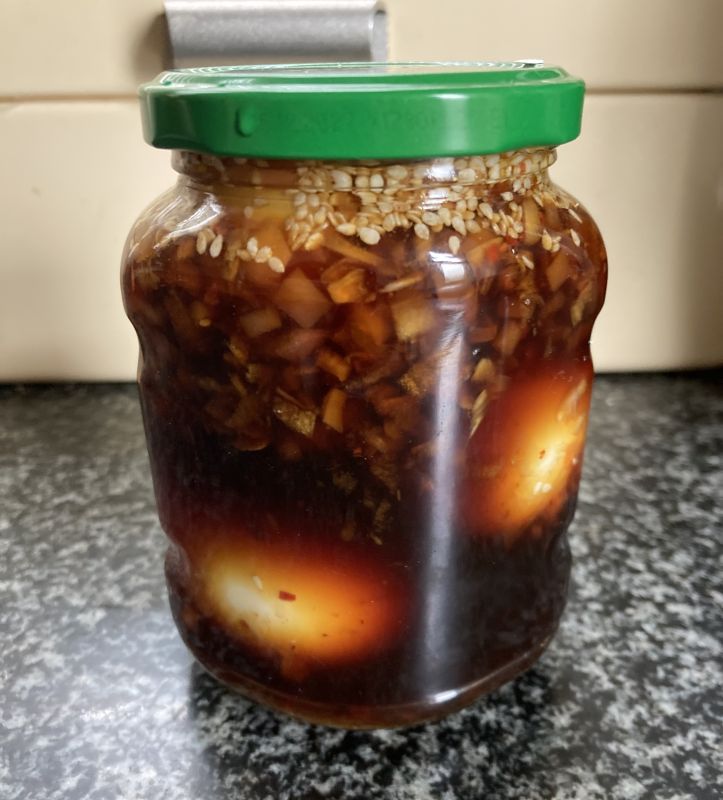 Laatst bij het paaseieren zoeken stuitte ik op het recept dat @Wortel onder de aandacht bracht in het kwarteltopic: Koreaanse ingemaakte eieren. Morgen eten we witte rijst met Choi sum uit de tuin. En het ingemaakte eierenrecept leek me daar prima bij passen. Dat heb ik alvast gemaakt, hoe langer het staat hoe lekkerder denk ik. In de inmaakmarinade niet zoveel uit eigen tuin behalve flink wat pepers van het vorige seizoen.