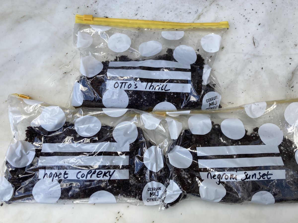 De dahliaknollen die ik van @Mellie heb gekregen hebben zich inmiddels 24 uur kunnen volzuigen met water. Omdat ik niet zo goed kon zien wat nou boven of onder is, geïnspireerd door @Vrouwholle , heb ik ze in ziplock zakjes gedaan met wat vochtige potgrond. De zakjes liggen voorlopig in de zitkamer met z’n drietjes in een bakje i.v.m. de temperatuur. De komende dagen even in de gaten houden waar zich een uitlopertje laat zien.