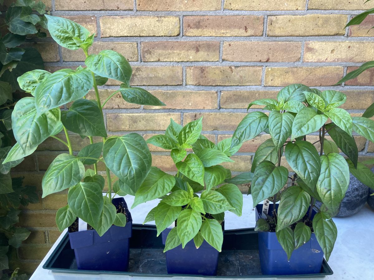 Even m’n 3 mooiste pepers showen 😊. Eigenlijk zijn het er 9. Ik ben er erg blij mee, zeker omdat ik ruim 3 à 4 weken later dan normaal met deno ben begonnen dit jaar. Onderstaande planten zijn pas 2e week februari vanuit deno de aarde ingegaan. Links staat de Peruvian Arancio (Baccatum). Hier ben ik erg benieuwd naar. Hij zou goed rauw te verwerken zijn, maar ook uitstekend in te maken, te vullen en erg lekker zijn voor hot sauce. In het midden de Habanada (Chinense). Daar heb ik vorig jaar zoveel plezier van gehad, sowieso een blijvertje. Helemaal rechts de Black Pearl (Annuum). Soort van sierpeper, maar ook te verwerken tot (hele hete) flakes. Het oudere blad begint inmiddels wat donkerder te worden.