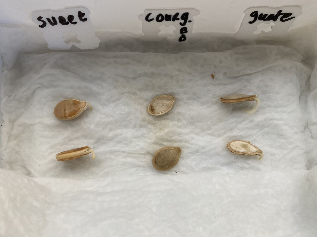 Ok….. We zijn 24 uur router verder en álle vier de pompoenzaden die maar niet wilden, laten hun worteltje zien! Het lag dus aan te koele omstandigheden. Op zich geen ramp, maar na ruim een week deno ligt rotting op de loer. Ik ben zó blij. Er staat een emmer met potgrond in de bijkeuken iets op te warmen en vanavond gaan ze geplant worden. De courgettezaadjes liggen er pas sinds gisteren, die blijven nog even liggen.