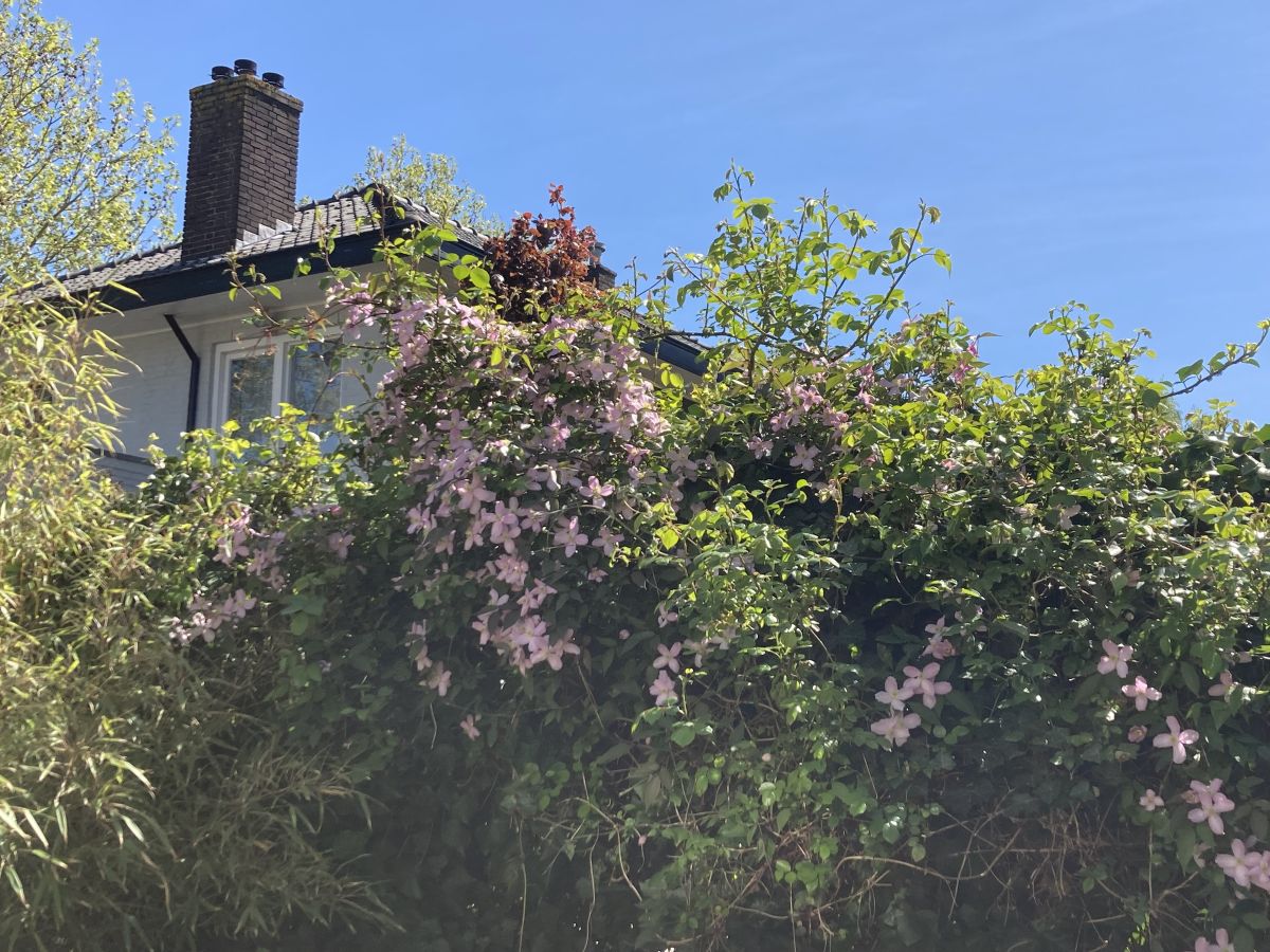 De clematis is nu in volle bloei. De roos groeit er doorheen. Nog even en dan bloeit die ook. Meestal gelijktijdig met de paarse clematis die na de roze volgt.