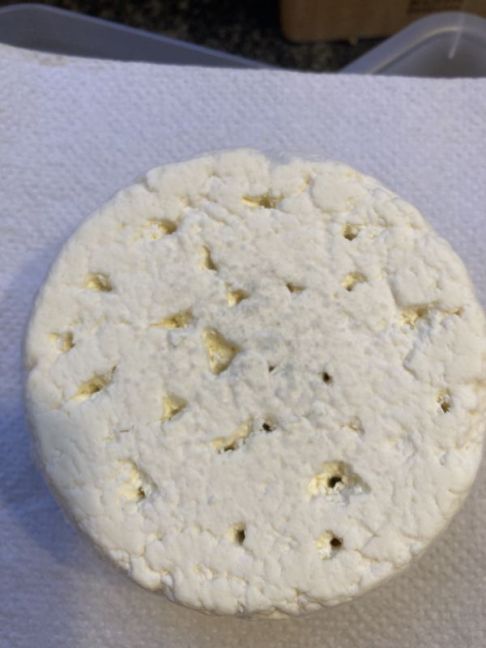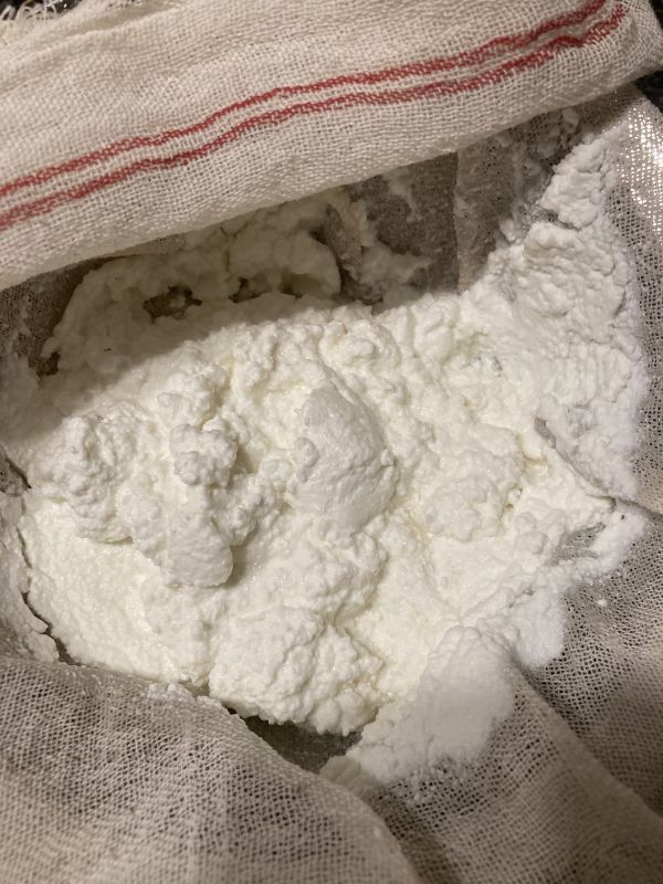 Ik hoefde de wrongel in ieder geval niet meer te snijden 😄. Onderin het vergiet zitten wel wat grotere klonten hoor. Ik ga gewoon door, we zien het wel. Vies zal het vast niet worden. Ik heb net wat van dit spul geproefd (nog niet eens gezouten) en het smaakt lekker: fris zurig en geitig. Mooi wit trouwens ook, zoals echte geit.
