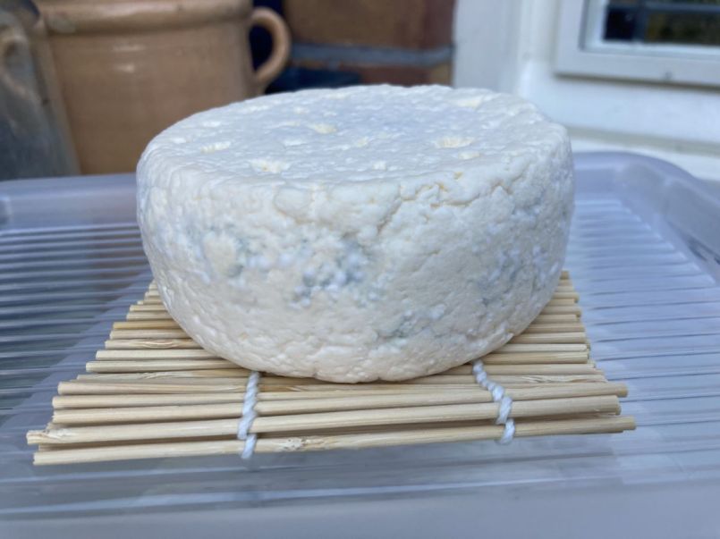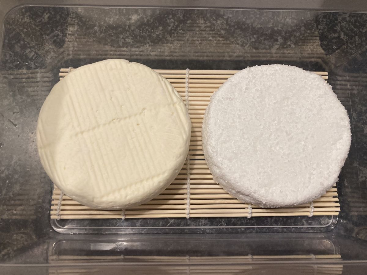 Het geitenkaasje staat inmiddels gebroederlijk naast de koemelk-variant in de rijpingsbak. Net toch wat bij gezouten. Je ziet nu goed hoe mooi wit geitenkaas is/wordt. Ik hoop dat het wat wordt, hij was nog erg zacht.