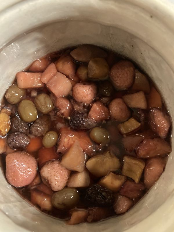Inmiddels heeft de pot 7,5 week gestaan. Gisterenavond nog eens doorgeroerd én geproefd. Straffe kost, maar lekker!!!! Alle fruitsappen hebben zich gemengd met de rum. Niet té zoet (ik had er wat minder suiker in gedaan dan voorgeschreven). De vruchten zien er vanzelfsprekend niet meer zo mooi uit als toen ze er in gingen. Sommige bramen zijn zelfs beige geworden. Maar ook het fruit is lekker. Hier kunnen we voorlopig wel mee vooruit. En dan vanaf het echte aardbeienseizoen weer opnieuw opstarten.