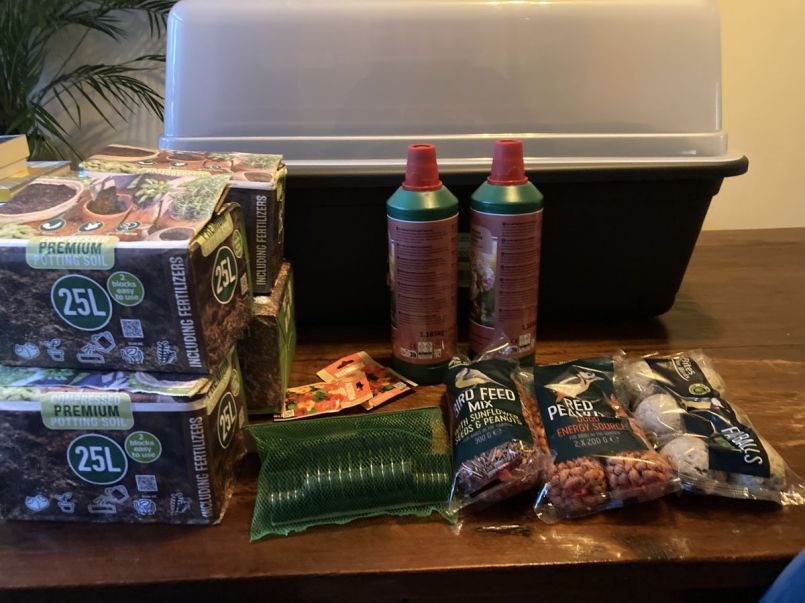 Vanmiddag even bij Action langs geweest. Vorig jaar was de potgrond heel snel op daar, nu gelukkig de laatste 5 pakken kunnen bemachtigen. Ik vind dat ideaal, 125 liter en het neemt vooralsnog geen ruimte in. Nog een extra kweekbak op poten. Voor de bladgroenten was dat vorig seizoen zo fijn! Vrijwel geen vraat en door de kap lekker vroeg starten met zaaien. Nu heb ik er drie 🥳. Vloeibare mest, nu wél met zowel N, P als K. Handige tuinclips, OI-kerszaadjes en wat voer voor de vogels. Helemaal gelukkig 😊.
