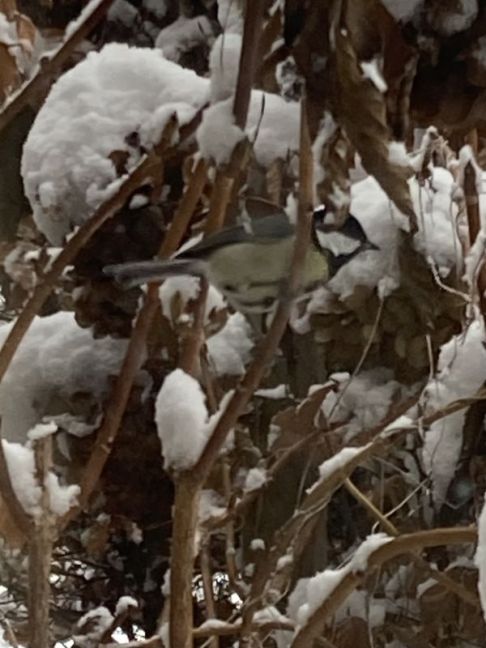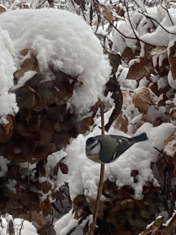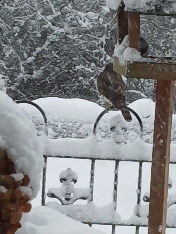 Zoals ongetwijfeld bij iedereen het geval dezer dagen, is het hier een komen en gaan van vogels bij de voederplaats. Een paar fotootjes. Onderstaande foto maakte mijn man vanochtend. Overduidelijk een roofvogel (die zijn kopje niet wilde laten zien). Die zien we zelden in de voortuin. Is er iemand die weet welke soort dit is? Edit: het is een sperwer volgens mij. Man zei dat de vogel een wittige buik had.
