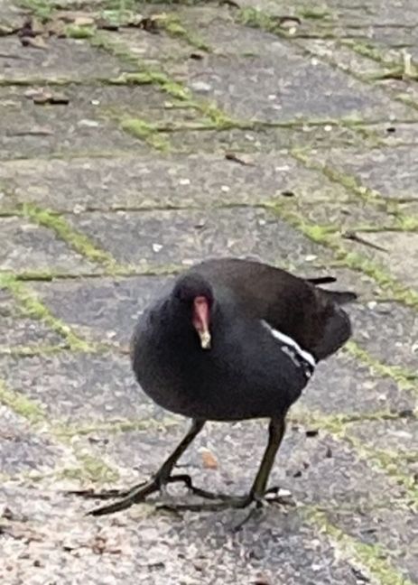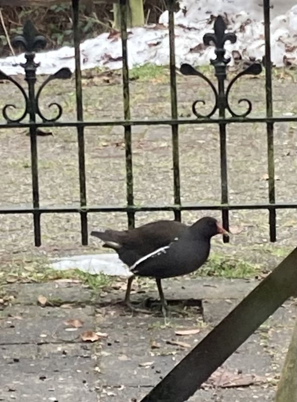 Kijk nou hoe leuk! Vanmiddag kwam er een waterhoen even een graantje meepikken onder de voedertafel. Op onderstaande foto zie je goed dat ze geen zwemvliezen hebben, en dat voor een watervogel. Weer wat geleerd 😊.