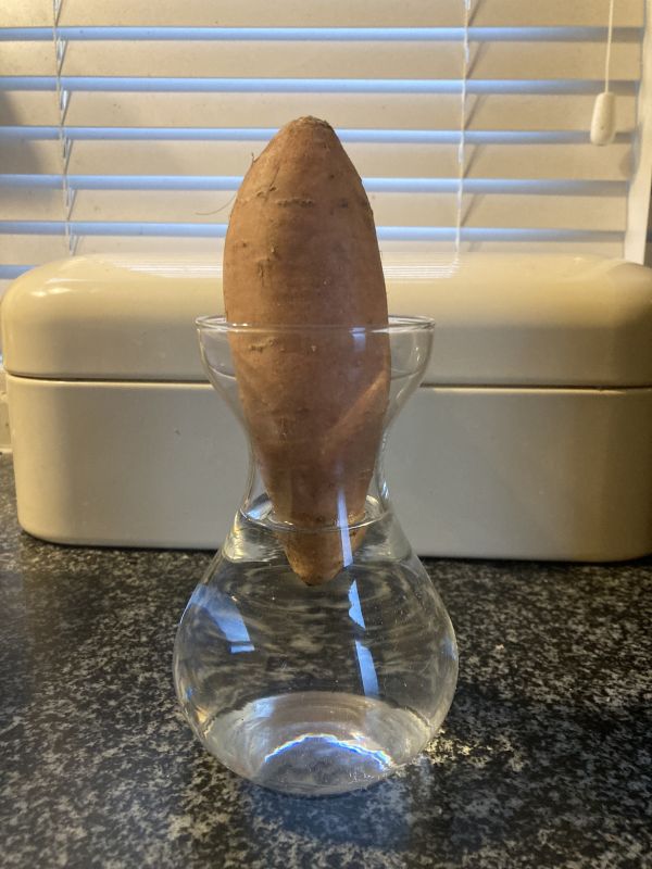 Mijn eerste plantsel van dit jaar. Ik loop vreselijk achter, met alles 😔. We eten vanavond iets met zoete aardappel, dus dacht ik: laat ik dat ook eens proberen dit seizoen. Nog nooit gedaan. Ik ben zeer benieuwd of het iets gaat worden. Een paar stekjes zal al voldoende zijn. Dit is dus een gekochte zoete aardappel uit de super. De soort is Bellevue. Alleen voor de naam al vind ik het de moeite waard om het te proberen.