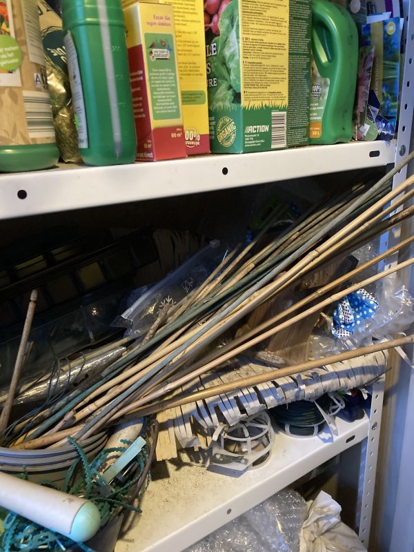 Ook ik maak ze niet schoon Tanja. Wat ik wel doe is einde seizoen alles uit potten en grond trekken, schoon vegen en dan gaan ze liggend op een soort vide in de schuur. De kanten die in de grond hebben gestaan steken wat uit. De hele lange staan in een hoekje in de schuur. En de kleintjes staan/liggen in een pot in de kast, ook in de schuur. Ze drogen dus de hele winter. Ik hoop dat dat eventuele schimmel de das om doet. Let niet op de rommel 😉.