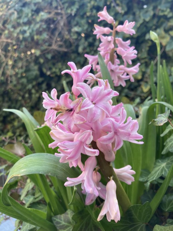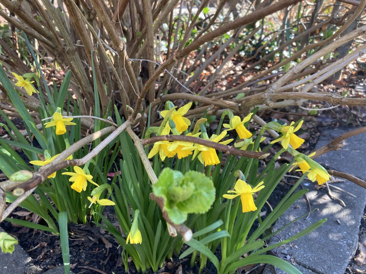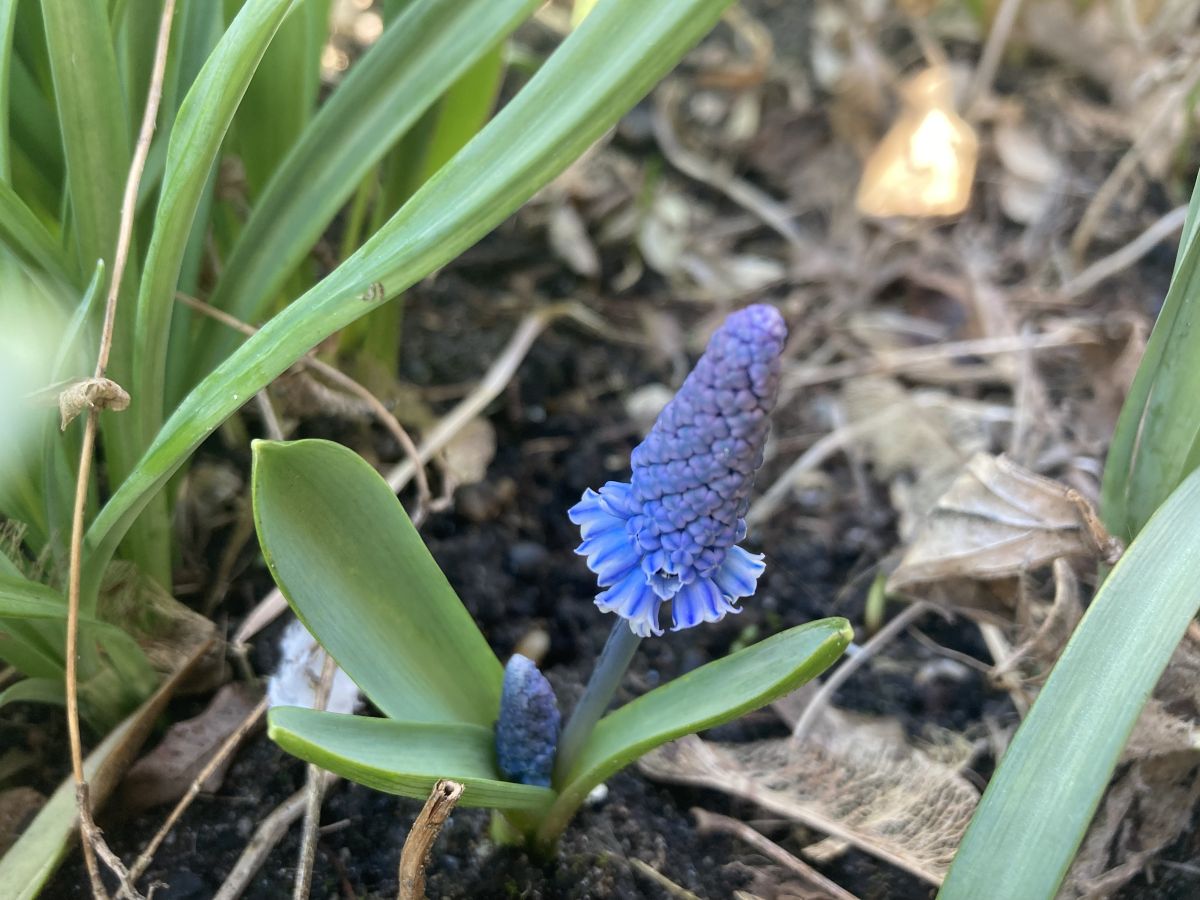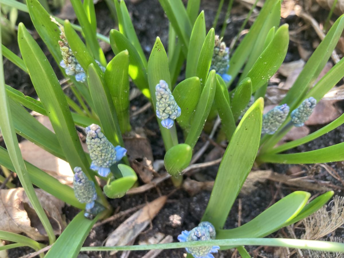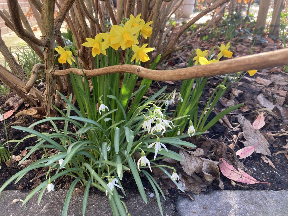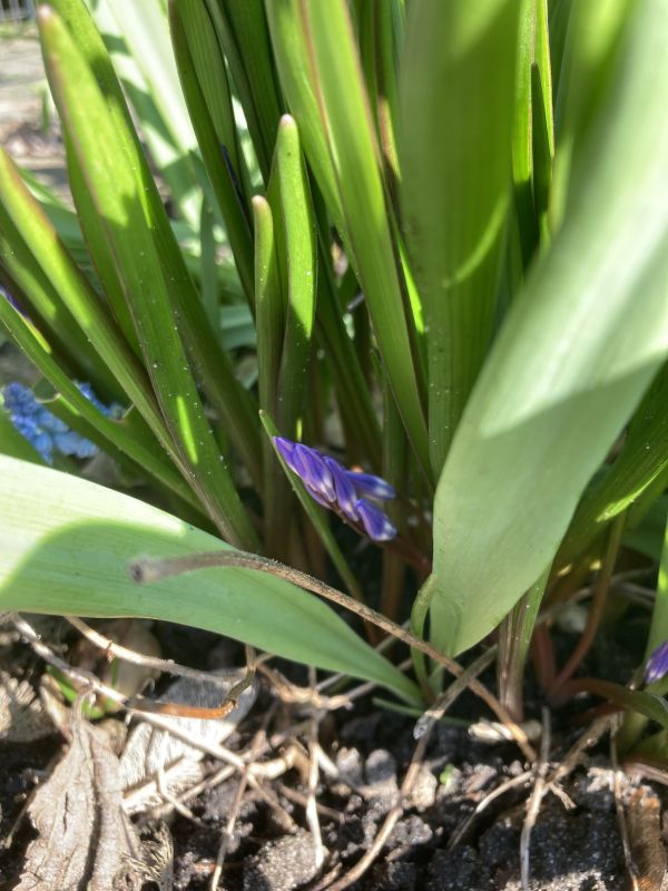Met dit weer staan er inmiddels heel wat bollen in bloei. Aan de voet van de nu nog kale hortensia’s bloeien de sneeuwklokjes en narcissen. Dat gaat nu extra hard omdat ze een week geleden zijn gesnoeid waardoor de bollen veel meer licht krijgen. In een ander perk komen de verschillende blauwe druifjes ook tot bloei. Deze hebben een heel aparte lichte kleur. En deze heeft een rokje aan. De scilla’s zijn ook bijna zo ver. De hyacinten bloeien ook al.
