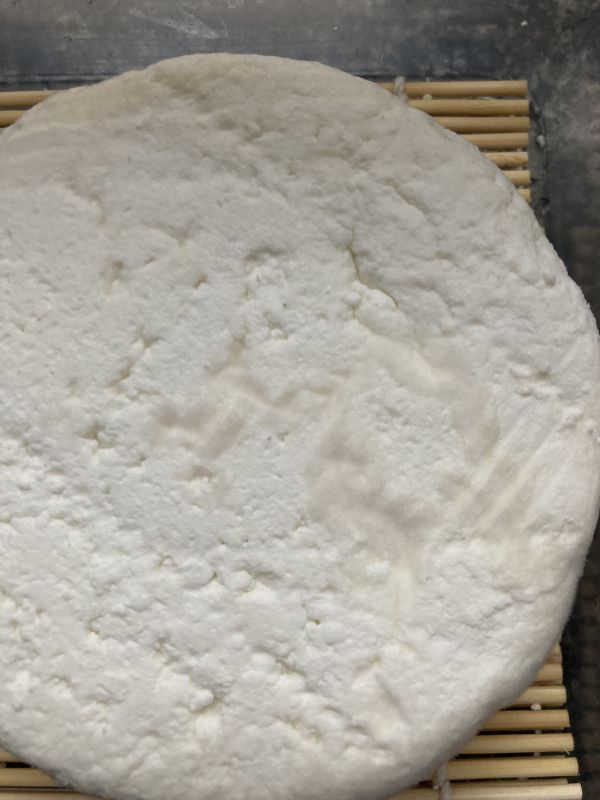 Het geitenkaasje staat inmiddels gebroederlijk naast de koemelk-variant in de rijpingsbak. Net toch wat bij gezouten. Je ziet nu goed hoe mooi wit geitenkaas is/wordt. Ik hoop dat het wat wordt, hij was nog erg zacht.