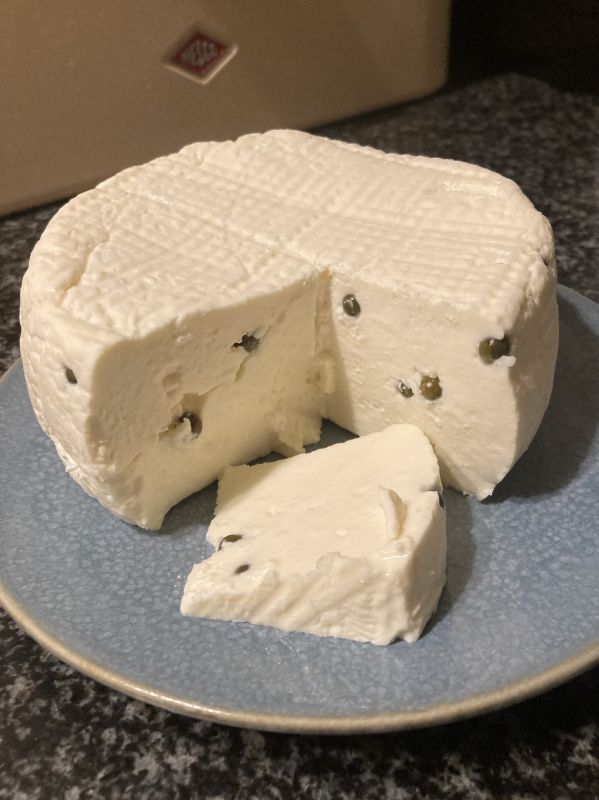 Hij heeft 3 dagen gestaan en vanavond moest hij eraan. Lekker! Niet te zout, die 2 uur pekelen bleek in dit geval precies goed. Groene peperkorrels ook mooi qua hoeveelheid. Ik heb uitgelekte groene peperkorrels van Carbonell gebruikt, 15 gram (geweld gewogen vanzelfsprekend) op 2 liter melk. Ik ben benieuwd hoe de smaak zich nog verder ontwikkelt de komende dagen. Dit ga ik vaker maken, zo lekker. Met dille of nigella denk ik. Of Provençaalse kruiden.