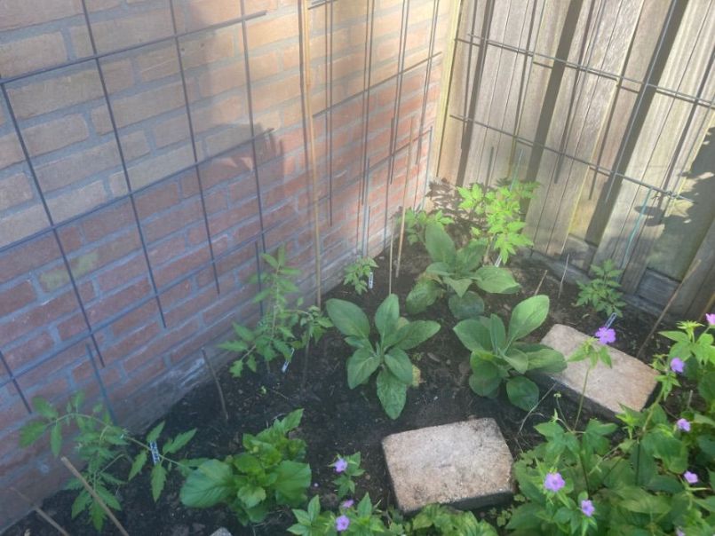Ja hoor, bij sommigen wel meer dan bij anderen. Als de volle zon er op staat gaan bij sommigen de blaadjes beetje hangen. Vooral bij de kleinste. Over een weekje gebeurt dat niet meer is mijn ervaring. Zodra de zon weer weg is, staan de blaadjes zo weer recht op. Ik geef ze geen 2 x per dag water. Gisteren flinke plens gehad, misschien morgen of overmorgen weer. De meesten staan hier wel in de volle grond. Wordt dat bij jou niet veel te warm met dat kasje dicht en dan de volle zon er op? Zeker met zo’n klein kasje loopt de temperatuur snel op tot boven de 40 graden (ik had er een thermometer in om dat in de gaten te houden). Toen ze bij mij nog in het foliekasje stonden, liet ik daarom de deur juist open. Zo staan er een paar hier bij. Net voordat de zon er op komt. Sinds ze in de grond staan lijkt het haast of je ze per dag ziet groeien 😃. Dit weekend geplant. De anderen gaan straks de grond in. Dit jaar er aan gedacht om bijtijds wat stapstenen er tussen te leggen zodat ik beter bij kan voor opbinden en dieven (en oogsten t.z.t.).