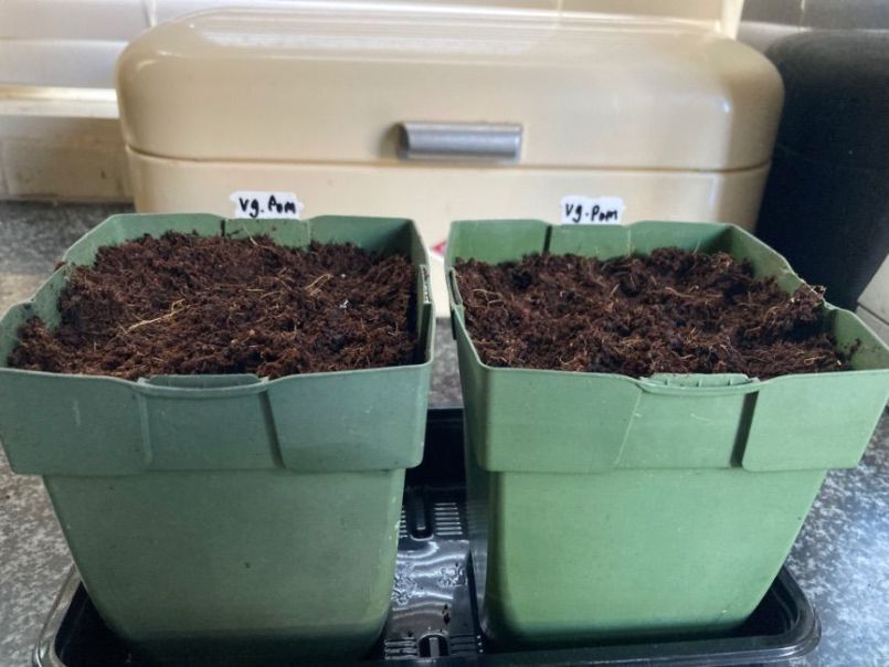 De laatste 5 tomatenzaailingen opgepot, vijgenbladpompoen gezaaid, de 2 golden eggs grotere potten gegeven en alle groenteplanten van vloeibare voeding voorzien. De rest van de tuin/potten heeft ook water gekregen. Morgen verder.