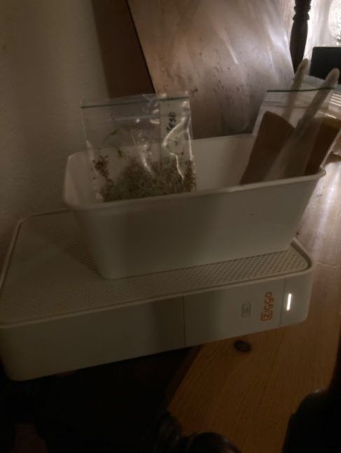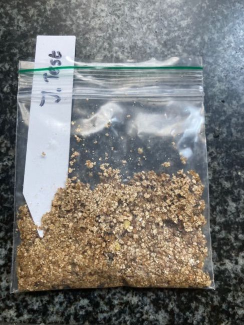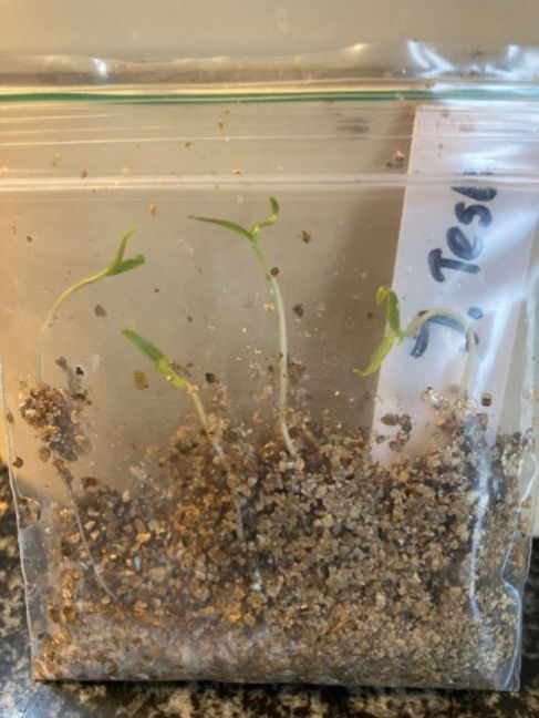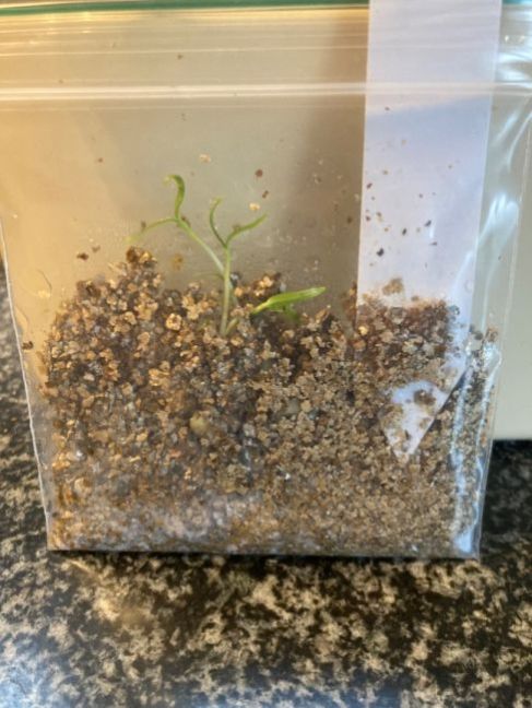 @appelvrouw Ik gebruik ook altijd bruine filters, maar soms nestelen de kleine haarworteltjes van het hoofdworteltje zich in het filterpapier. Als ik de zaailingen dan wil verwijderen, maak ik het papier goed nat en kan het meestal wel lostrekken. Maar dan moet het papier weer drooggedept voor de zaden die nog niet klaar zijn. Anders veel te nat. Best wel gedoe. Het vermiculiet heb ik 15 minuten in een glas met een laagje water laten ‘wellen’. Daarna goed laten uitlekken in een theezeefje. Vervolgens in het gripzakje gedaan en de zaden tussen het vochtige vermiculiet geduwd. Label erin zodat er wat lucht bij kon, zakje voor de helft dicht gedrukt. Hieronder een foto van mijn deno-opstelling. Staat op de onderste smalle plankje van tv-tafeltje, in een bakje van de Chinees, op de router die (tijdelijk) plat ligt. Op ongeveer de donkerste plek van de kamer. Absoluut geen direct licht, eerder wat schemerig, ook overdag. Doordat het zakje doorzichtig is, natuurlijk wel iets meer licht dan in een dubbelgevouwen filter. Maar, daardoor worden de blaadjes ook niet geel, mocht je een dag niet kijken 😊. Het vermiculiet uit het zakje roer ik door de potgrond waarin de zaailingen geplant gaan worden. In het begin doe ik zaailingen altijd in een mengsel van ongeveer 1/6 vermiculiet op 5/6 potgrond. Het wordt dus hergebruikt.
