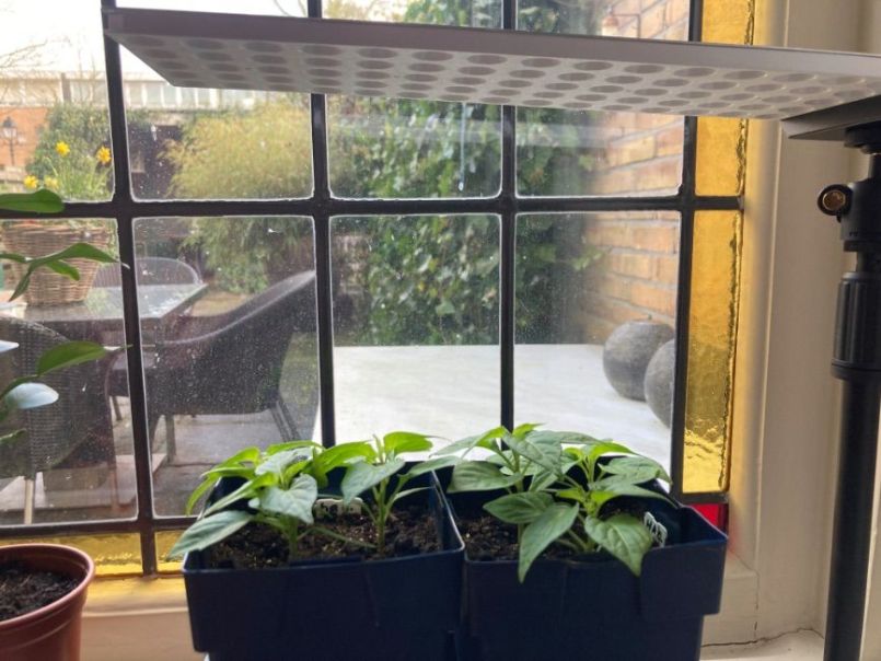 Als ze op het zuiden staan, dan alleen licht aan op donkere dagen. Zelf licht ik wel vanaf einde middag bij totdat we gaan slapen omdat ik begrepen heb dat zaailingen wel zo’n 16 uur licht nodig hebben. De dagen zijn nu nog relatief kort, vandaar. Verder zou ik je zaailingen al in een wat grotere potje zetten. Zelf doe ik dat per drie, dan kun je ze meteen wat dieper zetten. Dit is een foto van vandaag, twee potjes van drie.