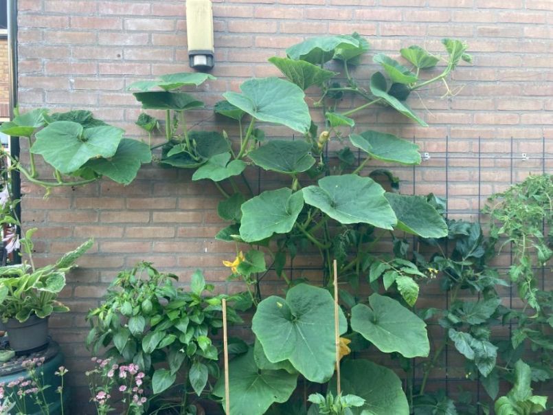 @7416bram Mits je voldoende zon hebt, is pompoen klimmend prima te kweken zonder dat het veel ruimte inneemt is mijn ervaring. Ik had afgelopen seizoen 2 uchiki kuri pompoenplanten op een halve meter van elkaar gezet en ze direct tegen een muur omhoog geleid. Prachtige muurbedekking en een goede oogst. Uiteindelijk hebben ze de hele muur bedekt. Ter illustratie op onderstaande foto waren ze net op een kwart.