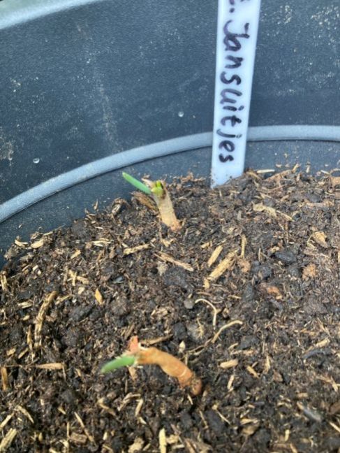 Nog maar 4 dagen geleden gepoot en nu lopen de eerste al uit! Ik denk dat ik over 2 weken al een groene pot + perk heb, leuk hoor 😃.