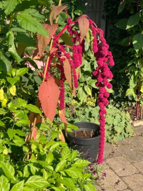 @Lia56 dat vroeg ik me ook af. Hier zijn de bladeren ook rood (geworden). Eerst waren ze fris groen. Rechts op de foto zie je nog een amarant, andere standplaats en in de volle grond. Die wordt nog niet rood. Jouw bladeren zijn veel feller rood, ik vind dat heel mooi 😍!