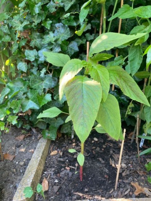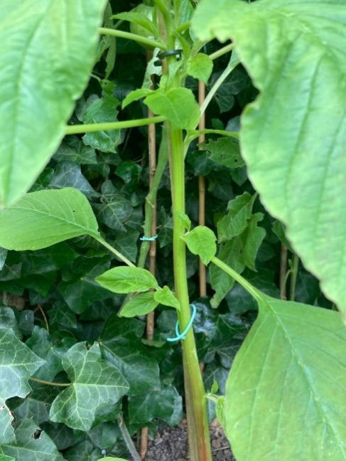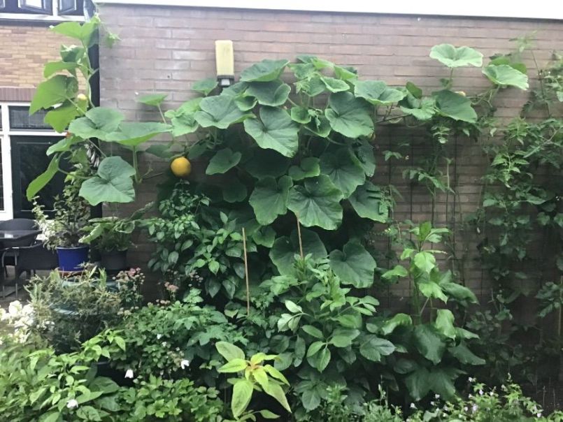 11. Heel veel tomatenblad en wat dieven verwijderd en de boel weer verder opgebonden. Alles wat de schutting met de buren dreigt te overgroeien net boven de laatste bloementrosjes getopt. Planten zijn allemaal 220 cm hoog ongeveer. Hoger kan dus niet helaas. De uitgebloeide vingerhoedskruidplanten gerooid waardoor er nu plek is om voor het eerst bieten te proberen. Die zaai ik morgen. Pompoenplanten verder geleid en opgebonden. De dahlia’s zitten vol met knoppen, wat extra steunstokken aangebracht. Nog een weekje voordat de eerste in de volle grond bloeit. Tenslotte de Klimspinazie verder omhoog geleid, ben benieuwd naar de smaak maar ook naar de bloemen straks.