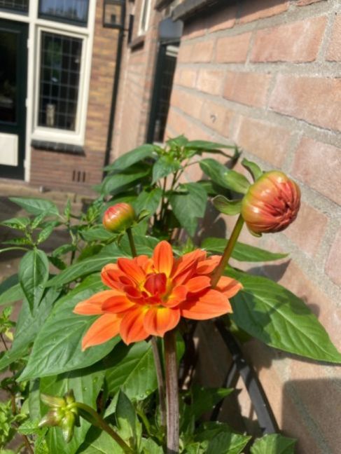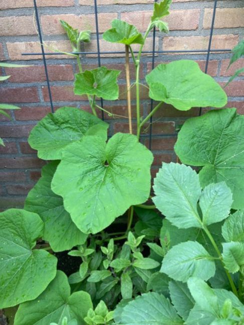 In mijn achtertuin maar plaats voor twee pompoenplanten, dit keer de uchiki kuri na 2 jaar butternut. Ze doen het goed ingeklemd tussen een dahlia en salvia (alles is hier ingeklemd overigens 😊). Ze staan nu zo’n 2 weken in de volle grond en worden omhoog geleid ivm ruimte.