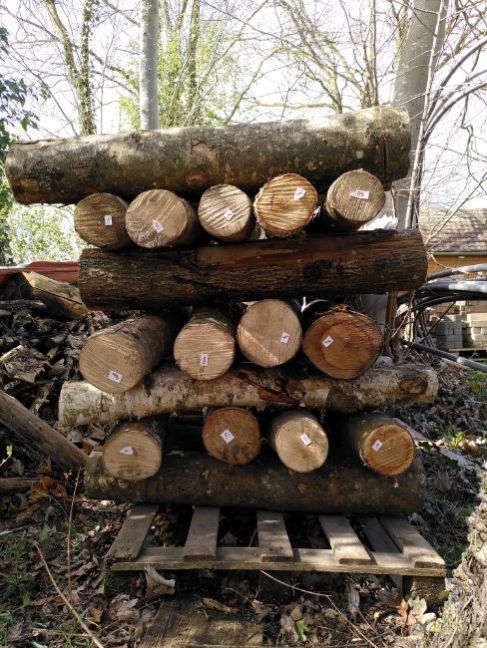 Afgelopen seizoen ben ik begonnen met een aardige stapel stammen. Ik ben benieuwd of ze na de winter zullen aanslaan. De onderste vier rijen zijn shiitake, terwijl de bovenste rijen experimenten zijn met lion's mane tot oesterzwam. De shiitakes zijn al mooi wit gekleurd met schimmel. En de rest nu ook , met sneeuw! 🥶