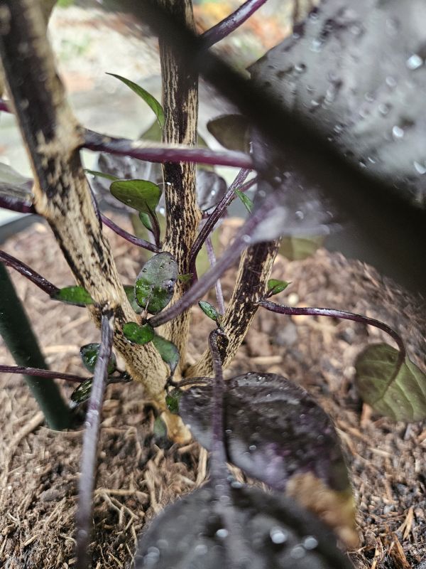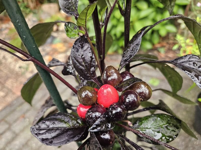 @Dahli , ze groeien in trosjes, rijpen af naar rood, en nee, beide fotos zijn vandaag genomen, de rode pepers zitten dieper verstopt, lager op de plant. 😅 Hier zijn ze, nog nat van de stortbui. Die vertakking en rechte groei erna is ook zo leuk.