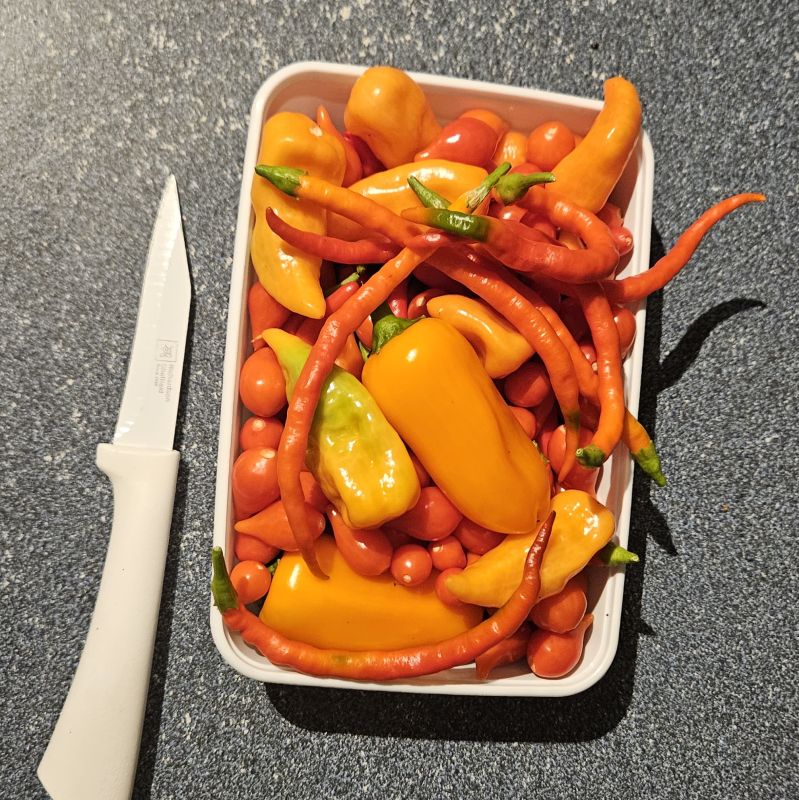 Hier ook elke avond de droger aan.. wel aflopend nu. Volgens mij hebben we aardig gelijke droogovens, Rorror? 😋 Wel veel van dezelfde hittegraad bij elkaar... 1x eerder superhots boven milde pepers gedroogd... die fout maak je maar 1x. Vooral veel Habanada, Biquinho (rood) en nog wat Rooster Spur nu, Nadapeño en oranje snack paprika staan vol in vrucht maar gebruik ik als snack.. En de Black Pearl kleurt gestaag van zwart naar rood...