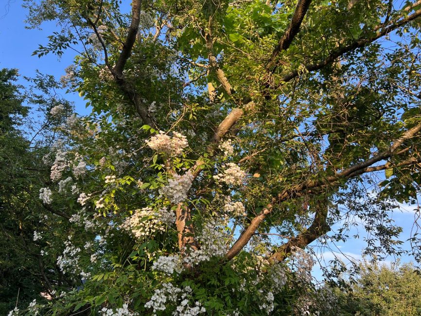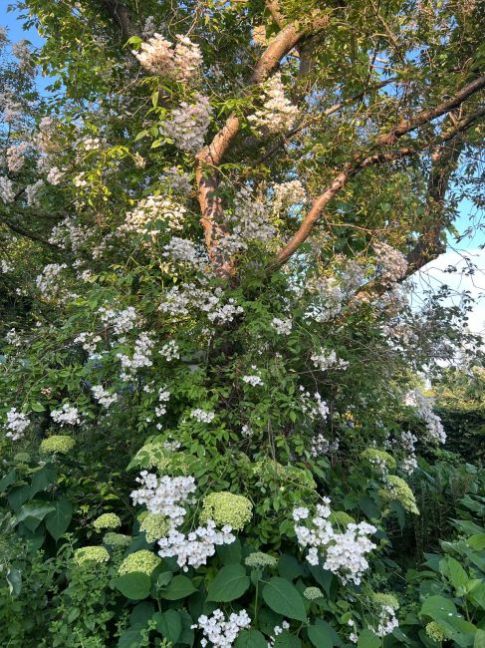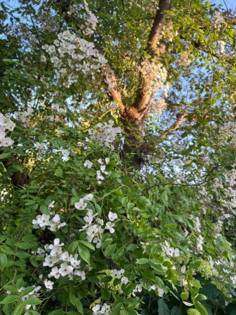 Hier groeit de klimroos voor het eerst uitbundig ruim 4 meter hoog de boom in 🙂. Binnenkort worden al die bloemen een massa kleine botteltjes. We genieten hier zo hard van!
