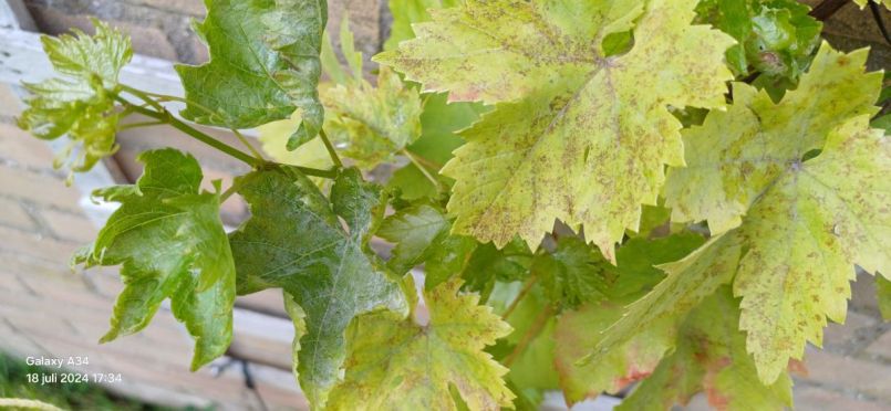 Ziet de druif er gezond uit? Naar mijn idee lijken de bladeren langzamerhand van groen naar geel te verkleuren. Voor de zekerheid een paar dagen geleden bemest en kalk gegeven.