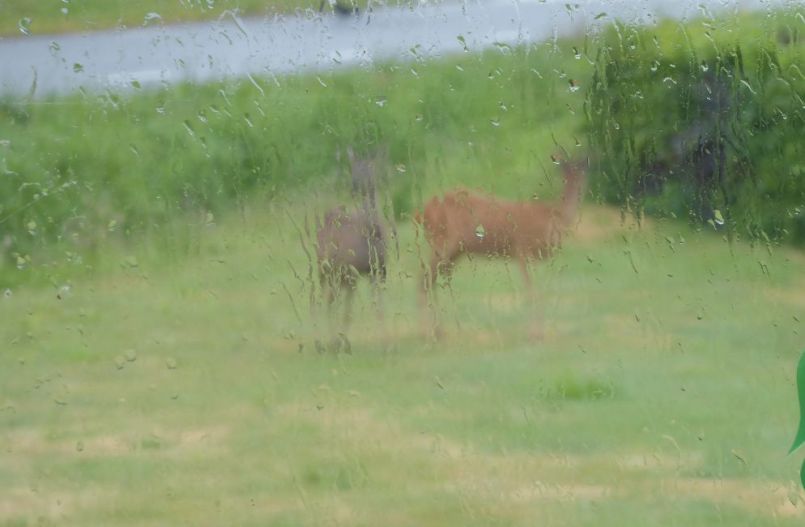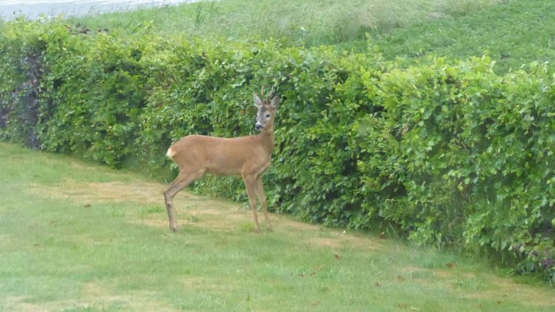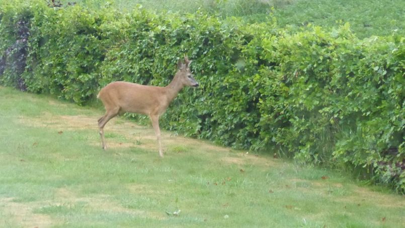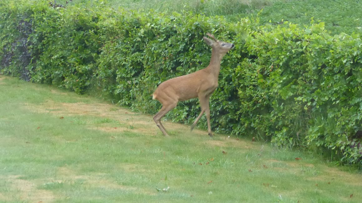 Twee reetjes in de tuin, een bokje en een hinde. De hinde denderde dwars door de heg naar het naastgelegen aardappelveld, het bokje sprong er vanuit stilstand zonder moeite overheen. Mijn dag is weer goed.🥰