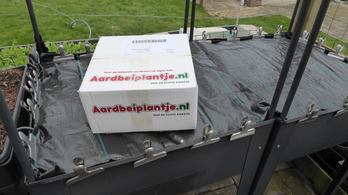 Twee bakken klaargemaakt, waar de aardbeiplantjes komen. Ze moesten even wachten, want tot nu toe hebben we bijna elke nacht wel nachtvorst gehad. Maar morgen wil ik ze er dan toch echt in gaan zetten. Dit worteldoek, waar ik dan gaten in maak, lijkt me handiger dan stro of zoiets.