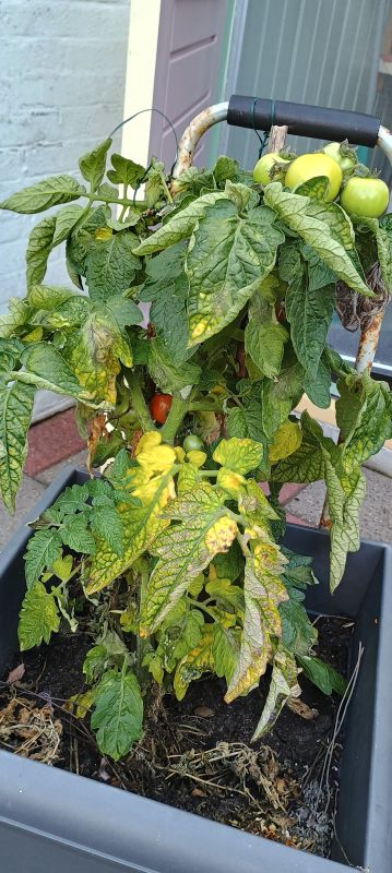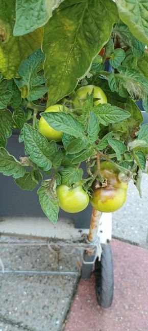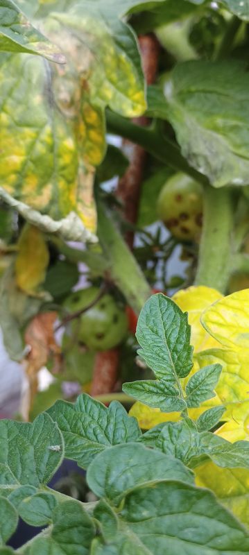 tomatenplant Roodkapje biologisch de tomaten vertonen bruine plekken bij de steelaanzet, dus niet van onder zoals bij cal. gebrek en tomaatjes met rare pukplekken zie laatste foto. Ook het blad ziet er niet uit. Ze staan buiten in de pot, dus ook met regen. en kou staan in de schaduw met veel zon. Wat kan dit zijn, ik hoop niet die phyt0pthora.....iemand een beter idee. alvast dank