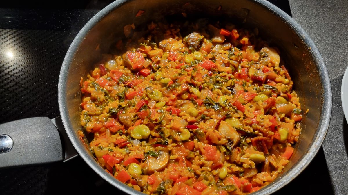 Ik heb de laatste dagen niet zo puf om te bedenken wat wij gaan eten. Dan pak ik mijn diepvriesboek erbij om te kijken wat er allemaal op moet van uet. Mijn man heeft vers gesneden (gekocht uit de supermarkt) Champignons, paprika, ui, knoflook, tomaat. Eeuwig moes en koolrabiblad, tuinbonen, bietenstelen en espelette peper uet uit de diepvries en de laatste minuten meegekookt met de zilvervliesrijst. Behalve de peper dan, die heb ik meegebakken met de ui, champignons en knoflook. Dan de rest toegevoegd inclusief kookwater en even pruttelen. Wat kurkuma, koriander, komijnkruiden en wat tomatenketchup erdoor. Worstjes gebakken (die hoefde ik niet) en eten maar.