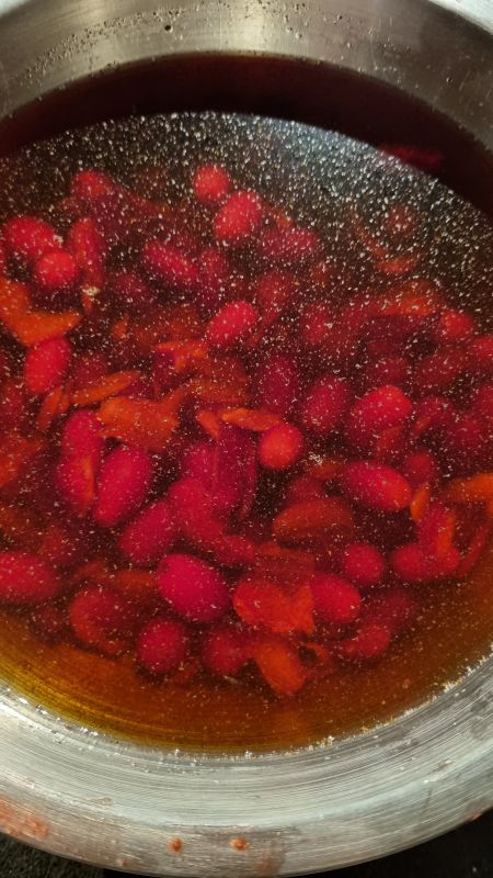 Het zijn geen Gojibessen, die ken ik ook, die zijn veel kleiner en die koop je altijd gedroogd zoals ik weet. Ik had van de week de foto ervan geplaatst. Hier is hij nog een keer. Het is de rode Aronia of rode appelbes.