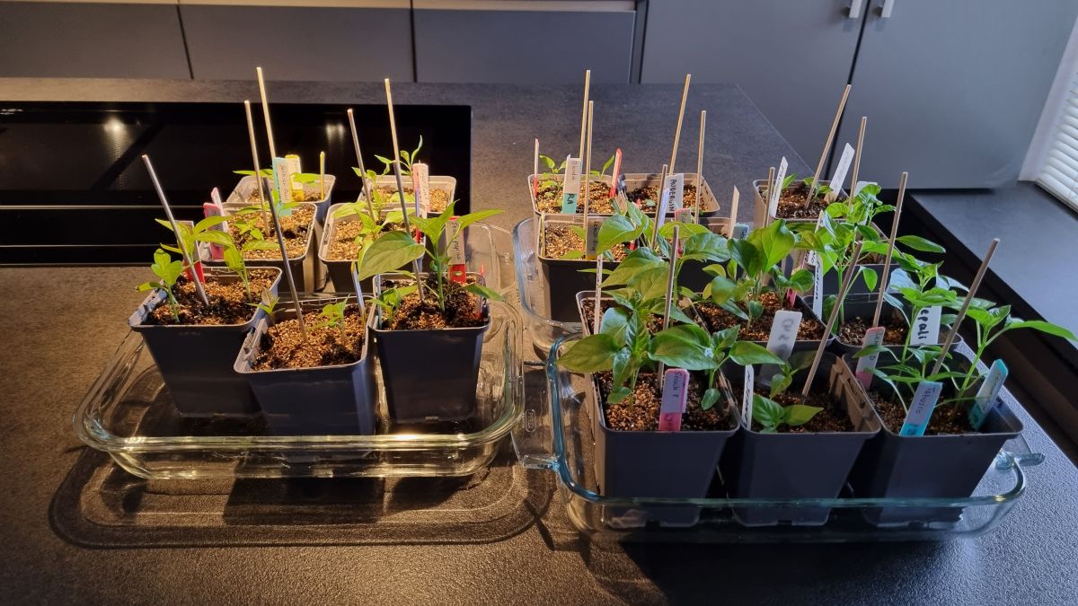 Ik heb de bak van de 1e zaaiing van pepers na een maand weggedaan. Ik dacht: sterke zaadjes komen gelijk op, graag of helemaal niet. Maar schijnbaar kan het dus nog langer duren. Bij mijn 2e partij is ook de helft opgekomen, net als bij de 1e partij. Ik heb ook nog een 3e partij gezaaid met pepers die ik toch graag wil hebben. Het kan ook komen dat ik te weinig licht heb, dan is het maar zo.