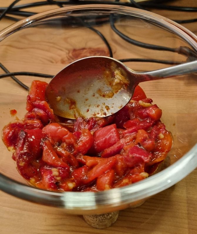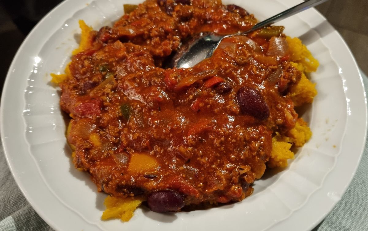 En weer Chili Con Carne, maar nu met zoete aardappel en geroosterde paprika en een wijntje. 4 x Rood heet dat. Met de pepers uet.