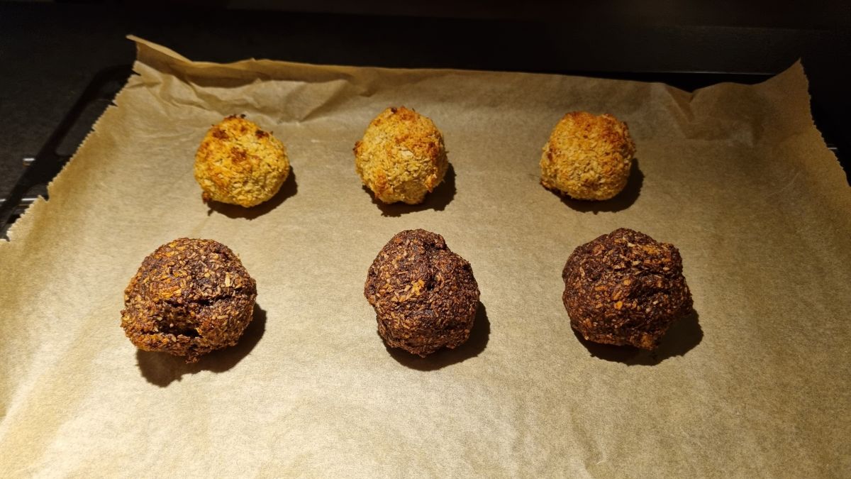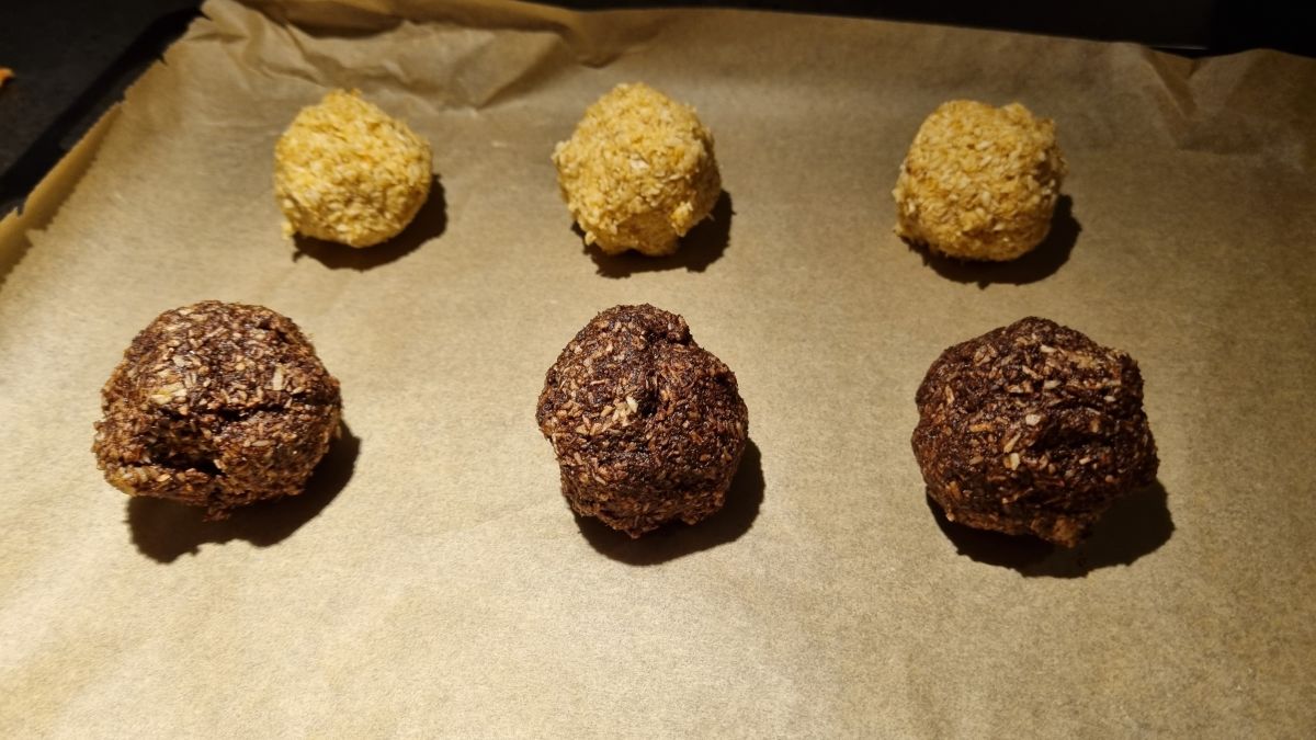 Ik ga ook weer kokos kopen, want ik heb het recept van @jootje ook gemaakt, had niet genoeg. Dus ik heb de helft gemaakt. Maar omdat ik wat wil minderen met suiker, wilde ik ze met dadels maken en dat gaat ook heel goed. De dadels malen met een sikkelmesje totdat alles fijn is. Het ei er even doorheen roeren en dan bij het kokos voegen. Van de helft van het deeg heb ik ook 15 gram cacao gevoegd, ook heerlijk! De volgende keer maak ik ze wel wat kleiner. Ik had totaal 6 stuks. En ik ga wat pure chocolade au bain marie smelten en de balletjes na het bakken erdoor heen rollen en even laten harden in de koelkast of vriezer. Dan heb ik een soort Bounty gemaakt, die vond ik altijd heerlijk, alleen te zoet en dat kun je dan zelf regelen. En je kunt het dus ook als een Bounty vormen i.p.v. een bal.