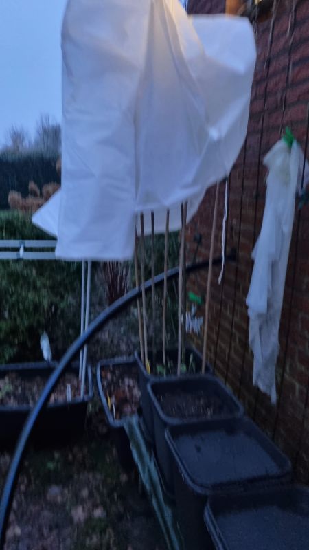 De bevroren emmer (emmer die leeg was gegooid en een klont ijs was) ontdooit elke dag een klein beetje meer, maar alle aarde in de bakken nog steeds bevroren, alleen een aangebroken zak aarde die ik gisteren in de werkplaats heb gezet is aardig ontdooid. En binnen heb ik wat zaai- en stekgrond staan en dus gisteren wel het e.e.a. kunnen zaaien. Mijn man was aan de telefoon, dus hij kon mij even niet helpen met de zware zak aarde te versjouwen. Dus ik heb met een schep gedeeltes overgebracht naar achteren via een emmer en een grote bus. Steeds een beetje. Na 4 x lopen had ik 2 bakken achter gevuld. Dan weer even water halen en de tuinbonen erin gezet. Even stokken gehaald, de achterkant hoeft niet, daar staat een rek. En dat alles tijdens de motregen. Om het te beschermen tegen vogels, muizen, ratten e.d. (ik zag er vandaag een) wou ik er een hoes om heen doen, maar help! Ik kon er net niet bij met die lange stokken. Toch even mijn man erbij moeten halen. En die rotslang die uit de grond komt zat natuurlijk in de weg. Zo goed mogelijk dicht gemaakt met knijpers aan de onderkant. Ik was intussen zeiknat. Hier op de foto zie je dat ik hem er niet overheen kreeg. Intussen dus wel, maar geen foto van gemaakt. Wij hebben eerst 6 weken koude en sneeuw gehad, nu regent het heel de week om het weer over te laten gaan in vorst aan het einde van de week. Dus het moest nu gebeuren om die tuinbonen erin te zetten, zij hadden al wortels van zo'n 12 cm Ik kijk even of ik morgen de doperwten erin kan zetten tussen de regenbuien door.