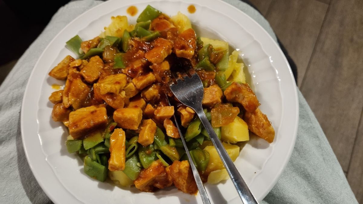 Aardappels met kalkoen en snijbonen uet. En een lekker jus/saus met div sambal, sojasaus, ketchup e.d. De potjes maak ik op, aan het eind van het jaar wil ik zelf sambal gaan maken, als mijn pepers meewerken.