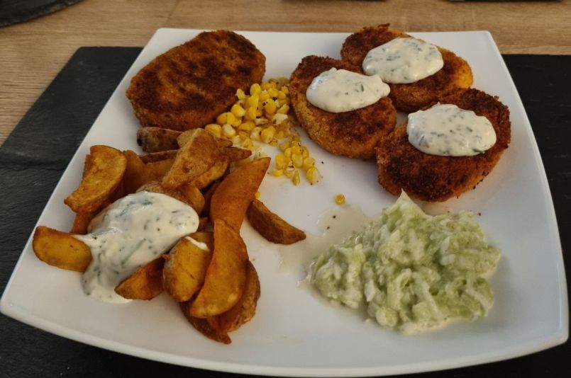 Bloemkoolkroketjes gemaakt en mais uet. Met een Griekse rondo, wedges en Tzatziki met komkommer en augurk uet. Een beetje veel was het.