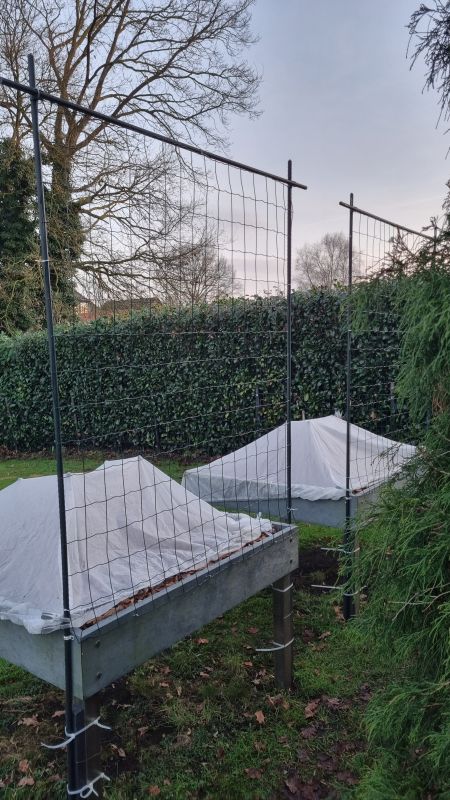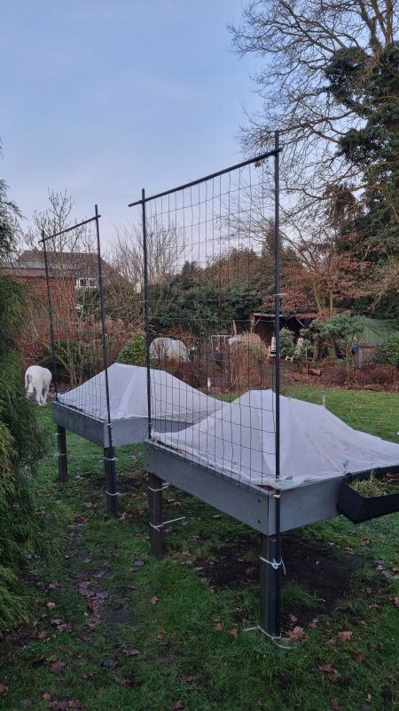 Zo blij dat mijn mannetje gisteren al de 2 rekken ging plaatsen met gaas, beter dan die van plastic van afgelopen jaar. 2 fotos geplaatst van 2 kanten genomen, dus het zijn er geen 4. Ook de Hochbeets (hoge kweekbakken) zijn geplaatst. Alleen nog geen aarde erin, dat komt nog. Intussen zitten de vogels alvast hun mest te plaatsen. De deksels moeten nog gelijmd worden, die kwamen beschadigd aan (zal er nog over schrijven), anders had ik die erop gedaan. Boven de kweekbakken komt ook nog gaas opgehangen aan de schutting, ook aan de andere kant waar de druiven groeien.