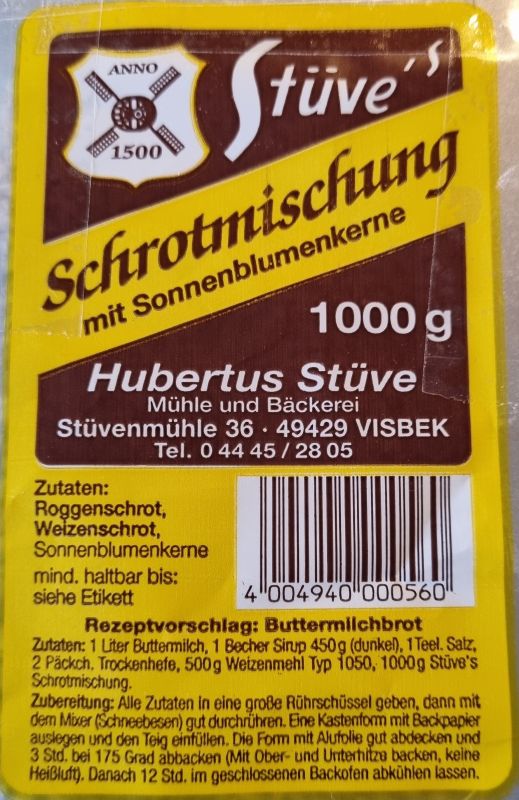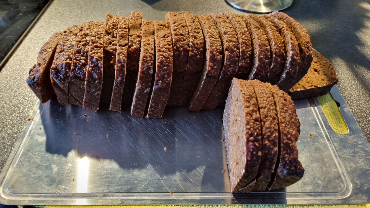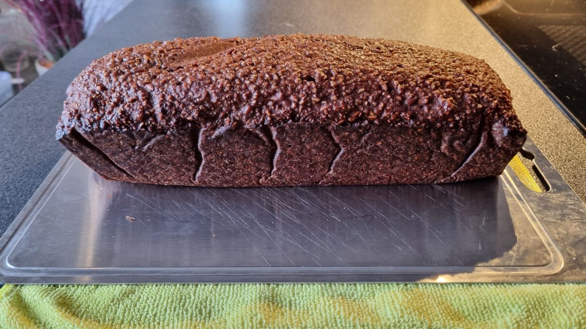 Ik had een heel typisch broodrecept. Ik heb een zak met mix gekocht (zie foto), daarbij moest ik diverse ingrediënten doen en niet laten rijzen, maar direct in de oven en dan 3 uur laten bakken en vervolgens 12 uur laten afkoelen in de oven. Daarvan had ik nog nooit gehoord, maar de smaak valt reuze mee. Moeilijk om te snijden dat wel. Maar het brood smaakte enigszins zoetig, omdat ik er dadelstroop doorheen had gedaan, wel wat minder. Ik heb niet de hele verpakking gebruikt maar de helft en van de stroop i.p.v. 225 dus 175 ml stroop gebruikt.